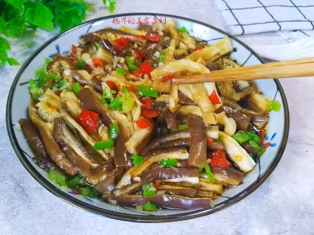 蒸好的茄子,稍放涼後用手撕成條放入盤中。