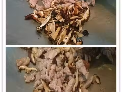 利用豬肉絲逼出的油脂繼續將香菇、蝦米炒香(乾香菇泡軟切絲、蝦米泡軟)。