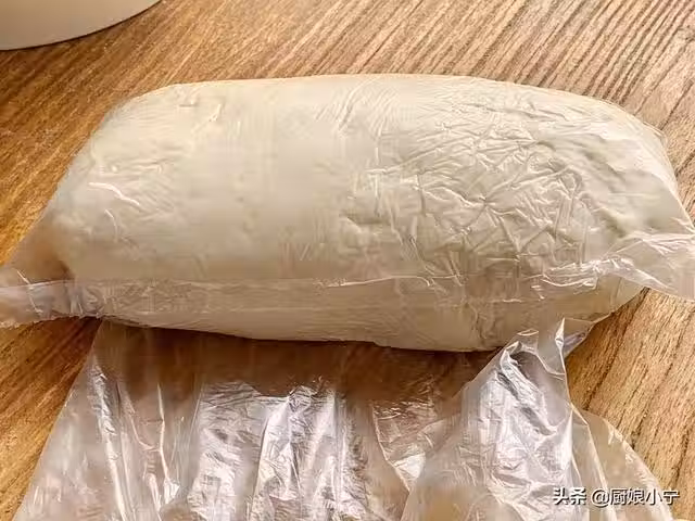 3,把麵糰裝入保鮮袋中,將麵糰整理成長方形,然後將口袋收緊,放入冰箱冷藏發酵一夜。麵糰在低溫的環境下,會進一步形成麵筋網,柔軟,扯不破,炸制的時候不跑氣,內部會蓬到很大。