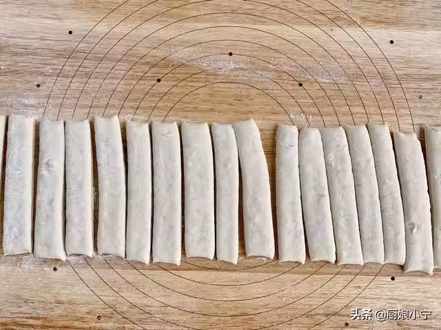 4,早上把麵糰拿出來,去掉保鮮袋,不要揉面,直接抻長,然後用擀麵杖再擀成厚度越0.5厘米厚的片。切成2厘米寬的條。