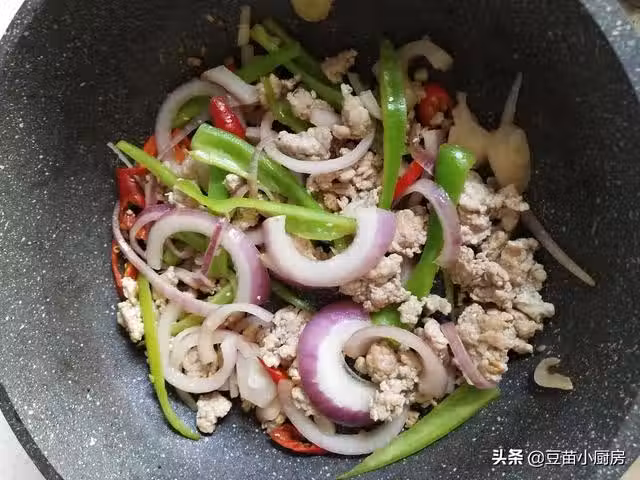 接著倒入切好的洋蔥,青椒絲,小米椒炒至變軟蔬菜斷生。如果喜歡吃洋白菜,白菜,土豆或其他蔬菜都在這一步放入哦,做法一樣的炒至斷生。