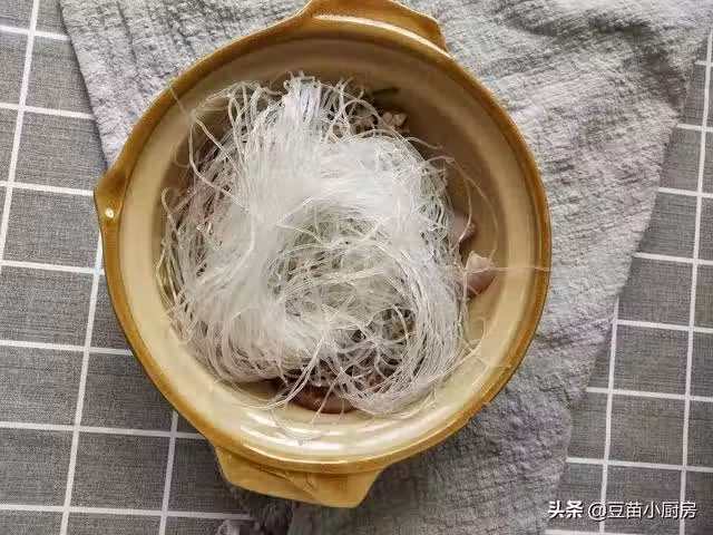 把泡軟的粉絲鋪在炒好的菜上。記得粉絲一定要提前用冷水浸泡,這樣做的時候更好熟。