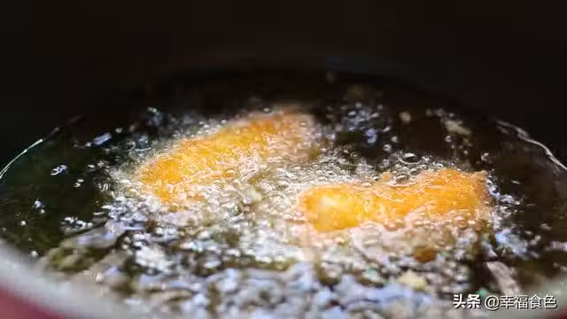9、將香蕉炸至金黃撈出來控油。炸的時候火不要太大,注意多翻面。