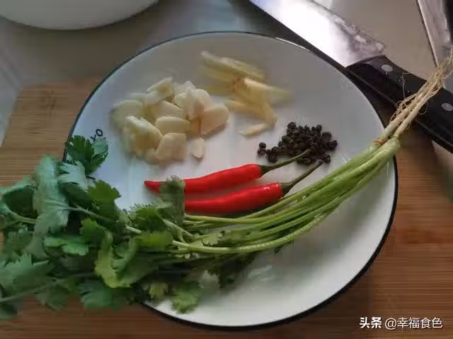 5、鍋里放入適量食用油,將大蒜生薑花椒和辣椒放進去,然後關火。急用餘溫將調料炒出香味。