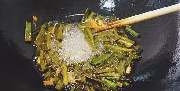 3:等小蔥段變成金黃色後,加入調製好的料汁,注意用鍋鏟攪動料汁,料汁開始冒小泡後關火,香噴噴的蔥油就熬製成功了。