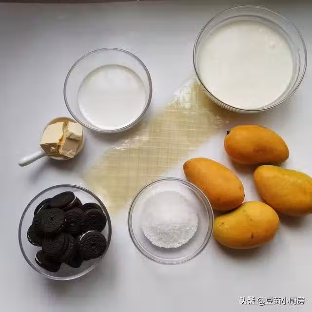 首先我們準備好所有需要的材料,用電子秤稱好克數,芒果我是用的小芒果,如果用大的兩個就可以了。餅乾可以用消化餅乾,我用的夾心餅乾,記得把夾心刮掉哦。