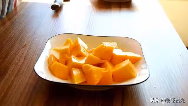 第五步、晾涼的過程中準備夾心用的水果,我用的是芒果和紅心火龍果,把芒果從中間切開,去掉果核,然後把果肉切十字花,塊切的大一些吃著更過癮。芒果切好以後放到盤子裡備用。
