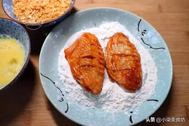 第七步:把裹上蛋液的雞翅放在薯片碎粒,裹滿薯片碎,看這個效果比裹麵包糠的要好很多。