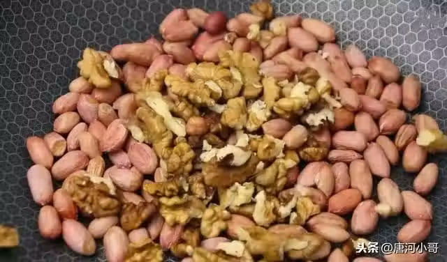3、把淘洗好的黑芝麻放在鍋中,開文火慢炒,大約15分鐘左右即可,這個時候用手輕輕一碾就碎,就說明黑芝麻已經炒好了,再來炒花生和核桃,將花生和核桃炒至輕輕一搓就掉皮就可以了,將炒好的黑芝麻、花生和核桃取出放涼。