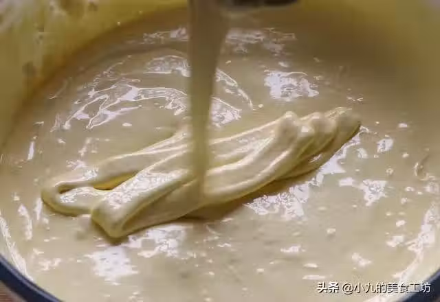 2、雞蛋攪拌好之後,再倒入150g麵粉。繼續用打蛋器攪拌1分鐘左右,最後將麵粉和雞蛋糊攪拌至細膩粘稠,提起打蛋器,能夠形成不易消失的紋路,製作蛋糕用的麵糊就搞定了。