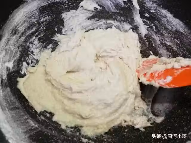 2、接下來再將清水、白砂糖、麥芽糖一起入鍋,煮至融化。麥芽糖和白砂糖都融化之後關火。倒入一半的糯米粉拌勻。再將剩餘的糯米粉倒進去,揉成偏硬的、光滑的麵糰。