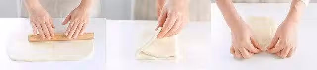 4、麵皮頂端和底端超出黃油片的部分用手指緊緊地捏合起來;然後把包好黃油的麵皮翻面,繼續用擀麵杖向四邊擀壓,擀成一張厚0.7cm左右的長方形麵皮。擀的時候要用力均勻,盡量縮短時間;用小刷子掃掉麵皮表面的手粉,把左右兩端分別向中間摺疊,折成三層,用保鮮膜包好放入冰箱冷藏30分鐘;