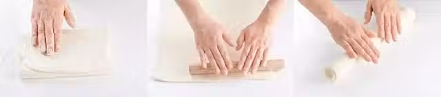 6、再次刷掉手粉,沿長邊摺疊三層,用保鮮膜包好放入冰箱冷藏30分鐘;冷藏完成後取出麵皮,輕輕向四邊擀壓,擀成一張0.3cm厚的方形麵皮。這時千層麵皮就已經可以使用了,製作酥皮或千層派都可以用到;如果暫時不用,可以把麵皮捲成卷包好保鮮膜放入冰箱冷藏,保質期為一周,使用時稍軟化後展平即可,如果是製作葡式蛋撻就不需要展開了;
