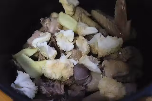 5、我們焯好水的土雞不能直接用,還需要用溫水將雞肉中的雜質沖洗乾淨,洗乾淨之後就可以將雞塊裝入燉鍋中了,現在需要的就是將準備好的猴頭菇倒入鍋中,然後將新鮮的生薑片倒入鍋中,現在需要加入足量的清水,然後用大火燒開,當水燒開後繼續用大火燉10-12分鐘,這時候需要改小火燉上1-2 個小時就可以了。