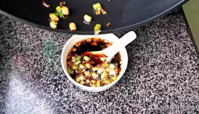 第五步:我們再調一碗腸粉的醬汁,碗中倒入兩湯勺蚝油,兩湯勺生抽,倒入適量的涼開水攪拌均勻,倒涼開水是稀釋醬汁的濃度防止太咸;起鍋燒油,放入蔥白爆香,趁熱把油澆在醬汁上面,一碗蔥香味十足的腸粉醬料就做好了。