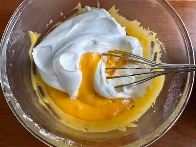 5、再倒回蛋白盆里繼續拌均勻,最後用刮刀徹底拌均勻,麵糊最後的狀態是這樣細膩有光澤的,我還加了一點檸檬皮,一定要試試這個口味的,超級好吃;