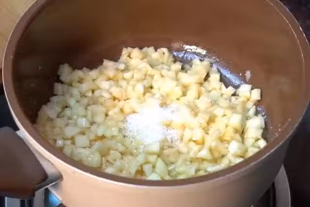 鍋中放入一塊黃油小火把黃油融化,倒入蘋果丁加入一勺白糖,最後倒入一點水澱粉勾芡,熬制黏稠關火出鍋晾涼備用