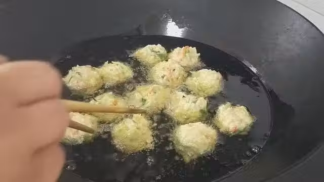18、一直炸到丸子變成金黃色,就是熟了,可以把丸子撈出來了