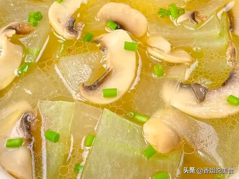 1、冬瓜用削皮刀削掉外皮,清洗乾淨後切成片。口蘑放入清水中,加入一點食鹽和澱粉攪勻浸泡十分鐘,再清洗乾淨切成片。