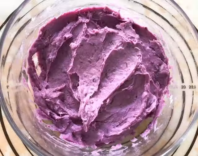 第三步:準備兩片吐司,去掉四周的邊,切成4半,取一個吐司塊,均勻的抹上一層紫薯泥,然後蓋上一塊吐司,蘸上一層雞蛋液,快速拿出來備用。