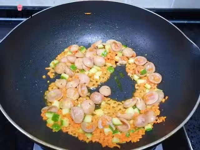 充分的炒散炒勻,你可以在倒入鍋中之前先把米飯撥散,這樣炒的時候更容易些。