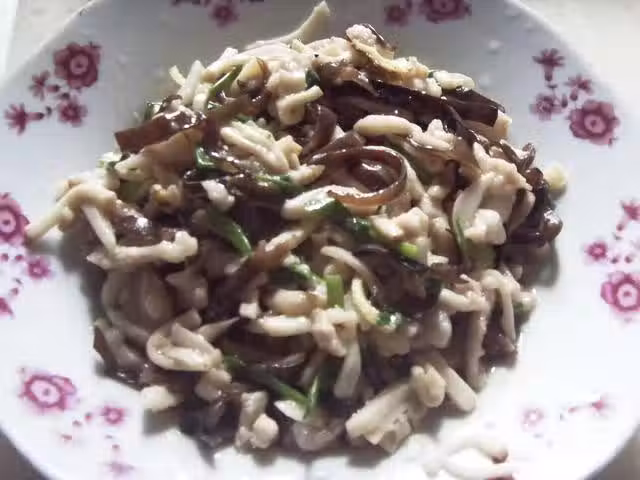 豬瘦肉洗凈切絲,加鹽、料酒、澱粉稍腌
