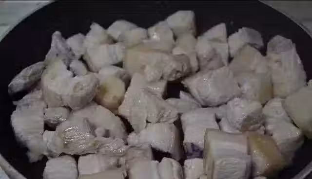 4、等肉上色後,調小火,觀察鍋內油,如果太多建議舀出去,留少許就夠了,不然會太油膩。然後將剛剛的湯倒入鍋中,微微莫過肉就可以了,加入適量鹽,再加入少許糖,調中火,蓋鍋蓋,中火慢煮;