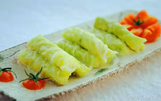 4. 大白菜葉分割成大小相等的片狀,取適量肉餡包卷進去,然後整形修邊,末尾的時候,塗上一點蛋糊,封口。依此反覆,做足夠的量,