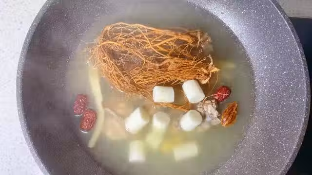4、小火燉煮三十分鐘後倒入山藥段和桂圓,再煮二十分鐘左右,最後調入食鹽就可關火了。湯里不需要添加雞精等其它調味料,這樣煲出來的湯原汁原味,有椰奶的清甜味道,口感非常好。