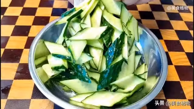 趁著這個時間,咱們處理一點其他的配菜。準備干黃花放在碗中,用溫水泡發,準備一把干木耳放在大碗中,用溫水泡發,泡發的時間大概是在20分鐘左右,接著準備根黃髮,洗凈之後無需去皮,先斜刀將其切成段,每一段長度大概是在三厘米左右,切好斷之後再將其豎過來,豎過來之後再切就是非常漂亮的菱形片了。切好之後將黃瓜裝入盤中備用。