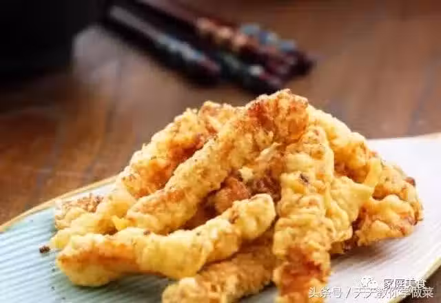 7、將油燒到七成熱,肉條放進去能馬上浮起來的程度,將肉條逐一放入鍋中,炸到微微變色就撈出來,這時鍋里的油會有噼啪的水聲,等到水聲沒了,再將肉條再次倒入炸半分鐘撈出;