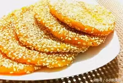 3、加入糯米粉,揉勻,醒15分鐘,揪成1小個劑子,搓成圓球,放在鋪滿白芝麻的碟子裡,輕壓成餅,兩面均勻沾滿芝麻。