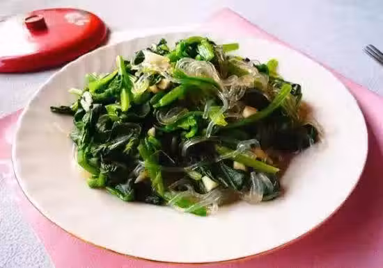 用料:菠菜900克,粉絲1小把,紅尖椒半個,杏仁12個,蚝油少許,芝麻油少許,色拉油適量,食鹽4克