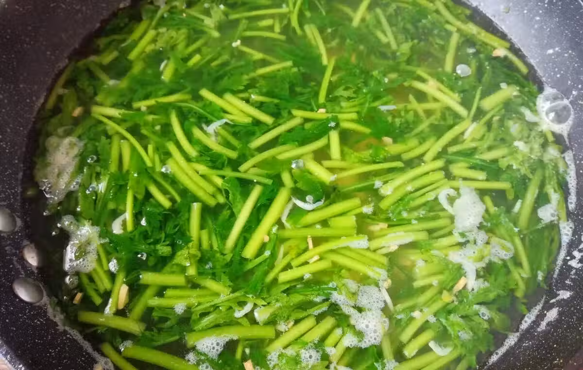 6.下入茼蒿梗,煮至顏色變深,再下入茼蒿葉,煮至顏色變深綠,加入鹽,雞精調味,關火,淋入香油攪拌均勻,盛出裝盤即可