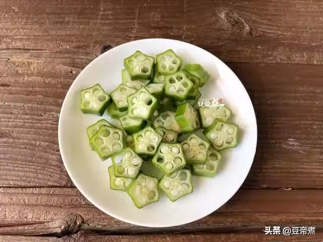 2、把秋葵清洗乾淨之後,橫切成小片這樣看起來有點像小星星很是漂亮。