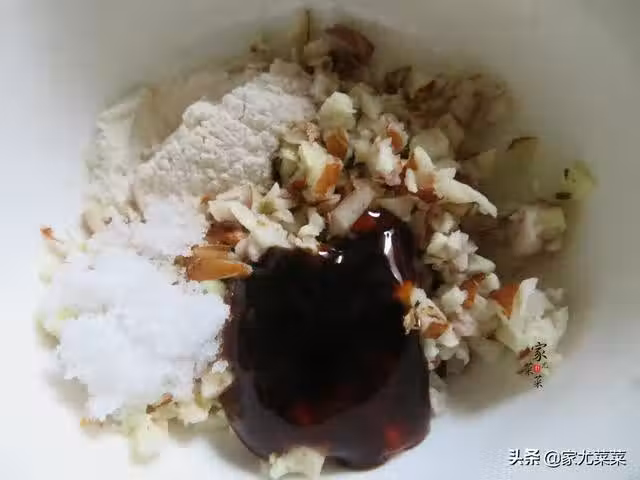 2、取幾塊新鮮的沙姜洗乾淨後拍扁切碎,加入小半勺食鹽和鹽焗粉,另外再加入一勺蚝油,倒入蒸雞汁攪拌成醬汁,上鍋蒸1分鐘。