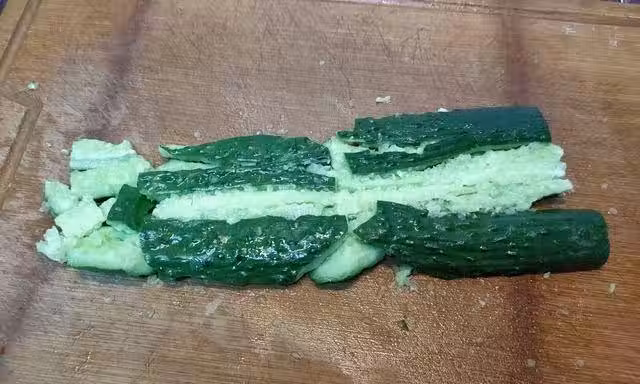 2、把黃瓜拍散後斜刀切成小塊,斜刀切黃瓜,黃瓜的刀口接觸面更大,也就更容易入味,飯店裡做拍黃瓜一般都會把黃瓜斜刀來切。