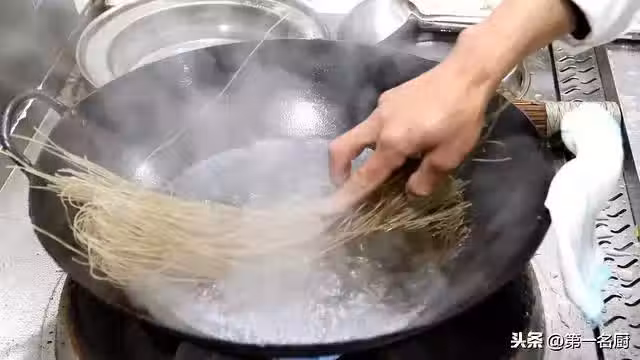 三分鐘過後,把燙好的粉條倒入漏勺中,過一下涼水備用,用涼水沖洗可以避免粉條粘連。