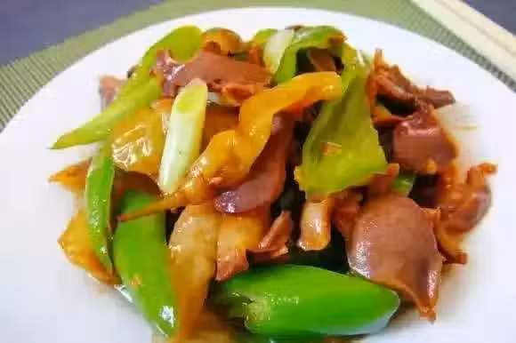 1、新鮮雞胗4個洗凈,用沸水焯過,焯過的雞胗冷後切片備用。青椒切塊,蔥切小段,姜與蒜切末。泡椒適量用清水稍微泡一下,切兩半。