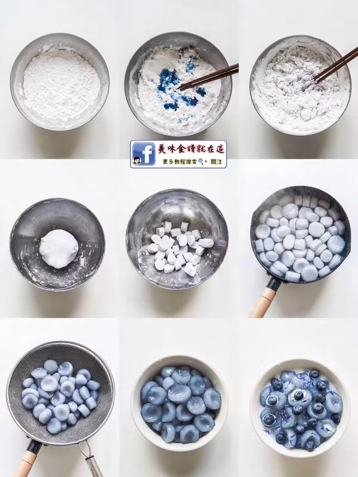 ▪️蝶豆花➕直飲水入鍋煮沸出色,過濾掉花朵,倒入加了細砂糖的木薯澱粉中,用筷子快速攪拌成絮狀。