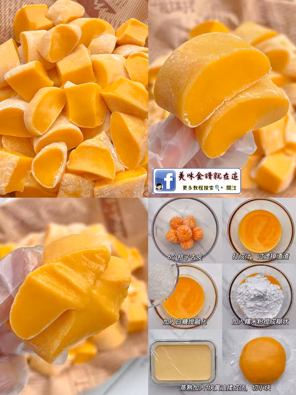 桔子去皮榨汁過濾掉渣,桔子汁加入糖攪拌融化,再加入糯米粉混合均勻過篩,上蒸鍋蒸30分鐘,拿出來趁熱加入黃油揉成團,滾熟粉切小塊即可;