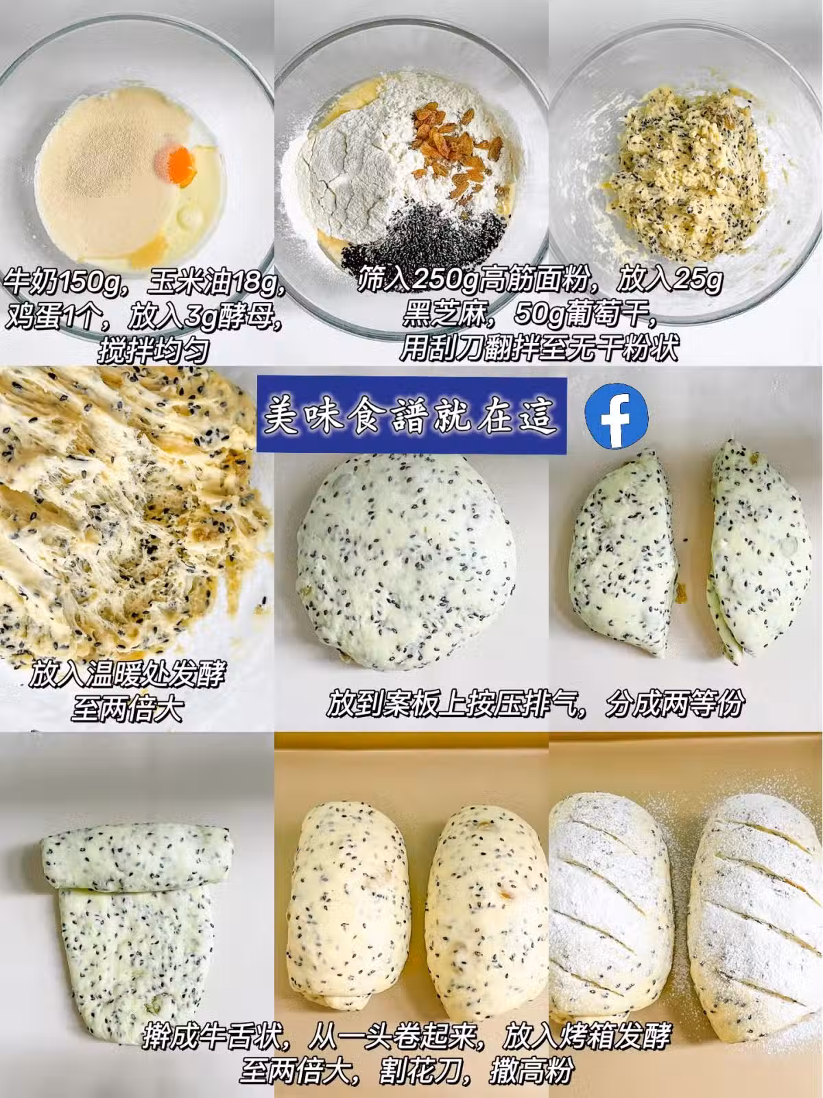 高筋麵粉250g,牛奶150g,玉米油18g,雞蛋1個,酵母3g,黑芝麻25g,葡萄乾50g。