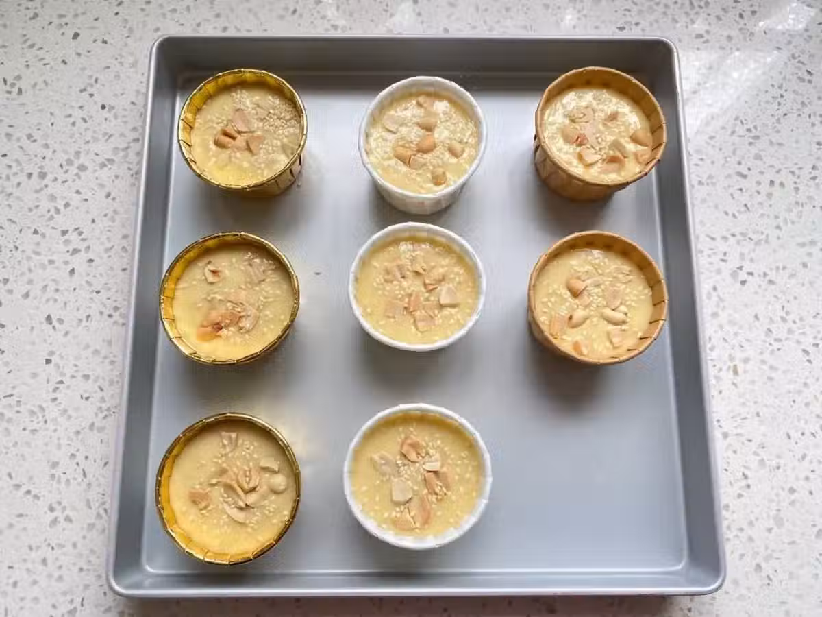 6、 烤箱提前預熱,上下管180度,然後將蛋糕放進烤箱中層,烘烤個半小時左右。看到蛋糕表面裂開,顏色變得金黃就可以了。烤好了的蛋糕出爐以後放在冷卻架上就可以美美地享用了。