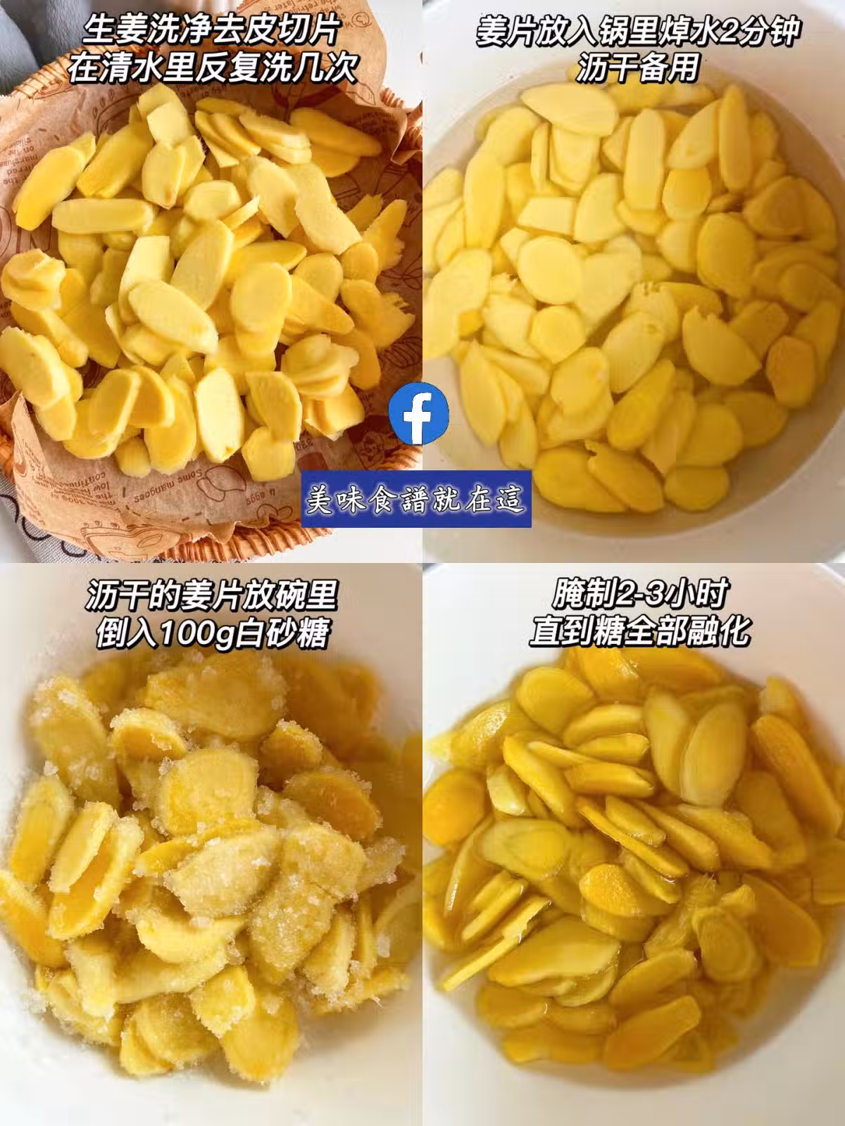2️⃣瀝乾的薑片放碗里,倒入100g白糖,腌制2-3小時,直到糖全部融化。