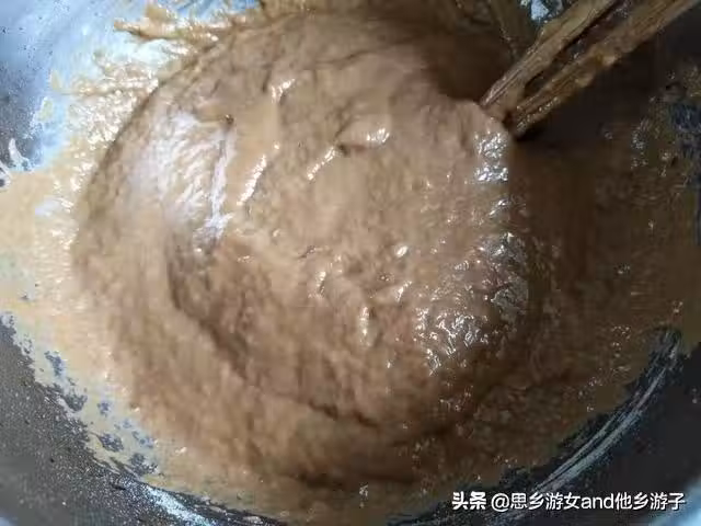 把雞蛋液倒入紅糖酵母水中,加入麵粉,邊倒邊攪拌成細膩粘稠有彈性的麵糊。