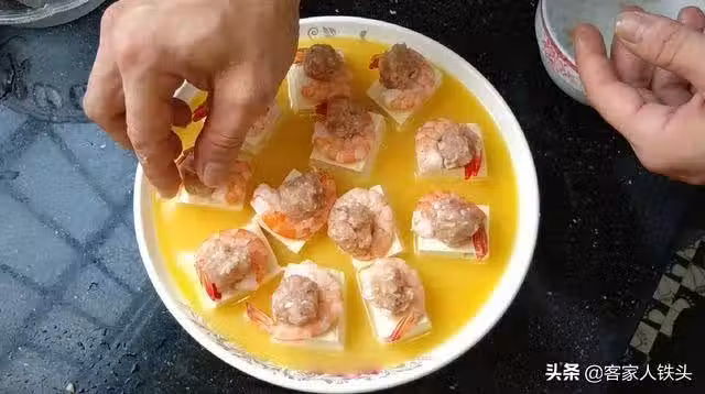 第十步:鍋中燒開水,把擺好盤的雞蛋豆腐蝦仁抱肉球放進去,蓋上鍋蓋,蒸12分鐘