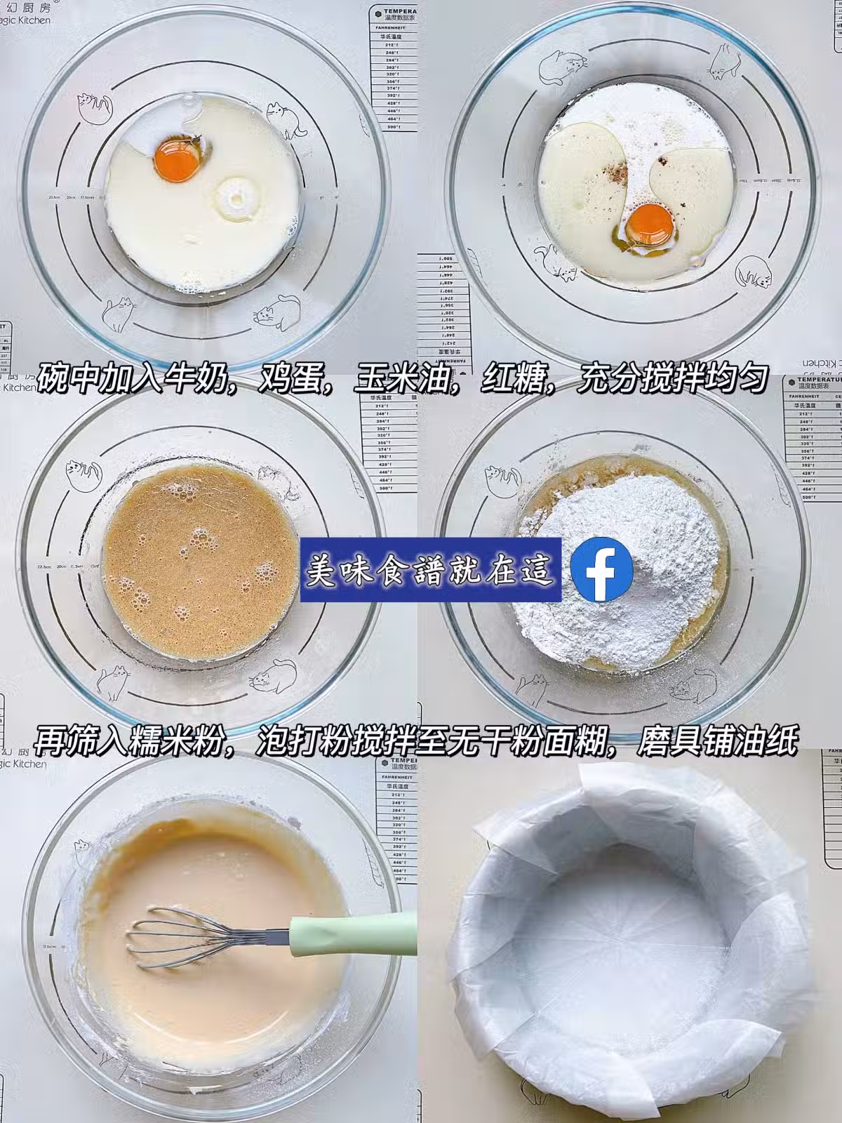 3⃣、六寸鋪油紙防粘,倒入一般的糯米糊,撒上剩餘的紅糖和紅棗粒,接著倒入剩餘的糯米糊