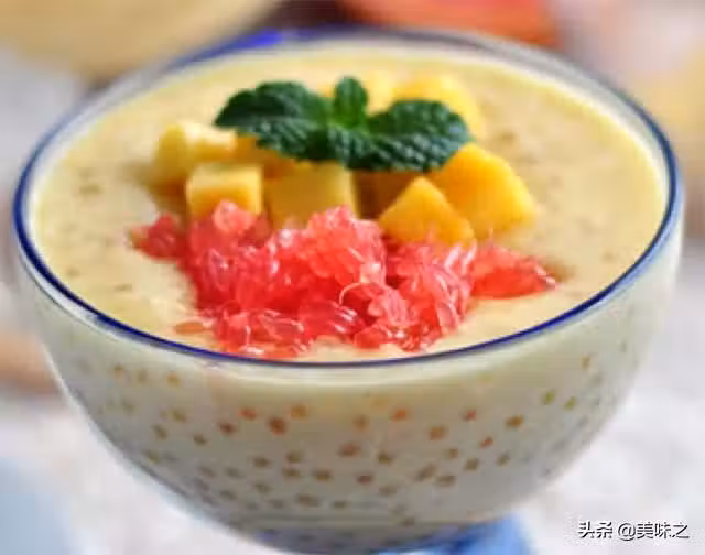 10、吃的時候,取適量芒果西米漿放入容器,再撒上西柚粒和芒果丁,即可。