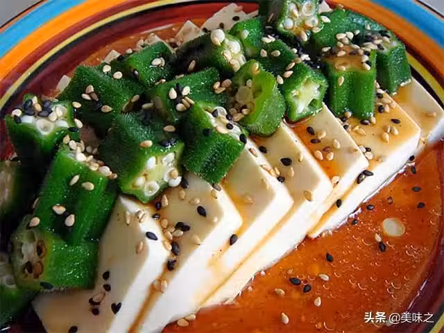 6、將秋葵放置在豆腐上。澆上沙拉汁即可。