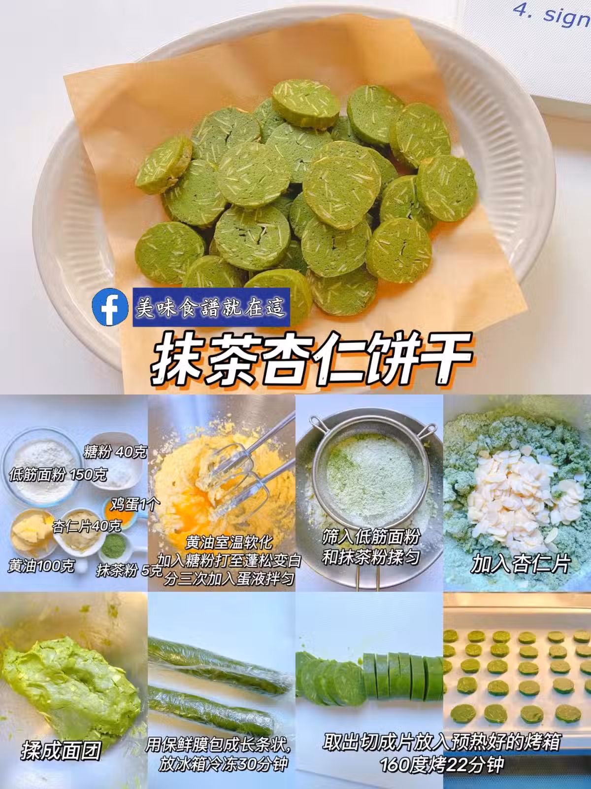 食材:低筋麵粉 150克,糖粉 40克,黃油100克,雞蛋1個,抹茶粉 5克,杏仁片40克